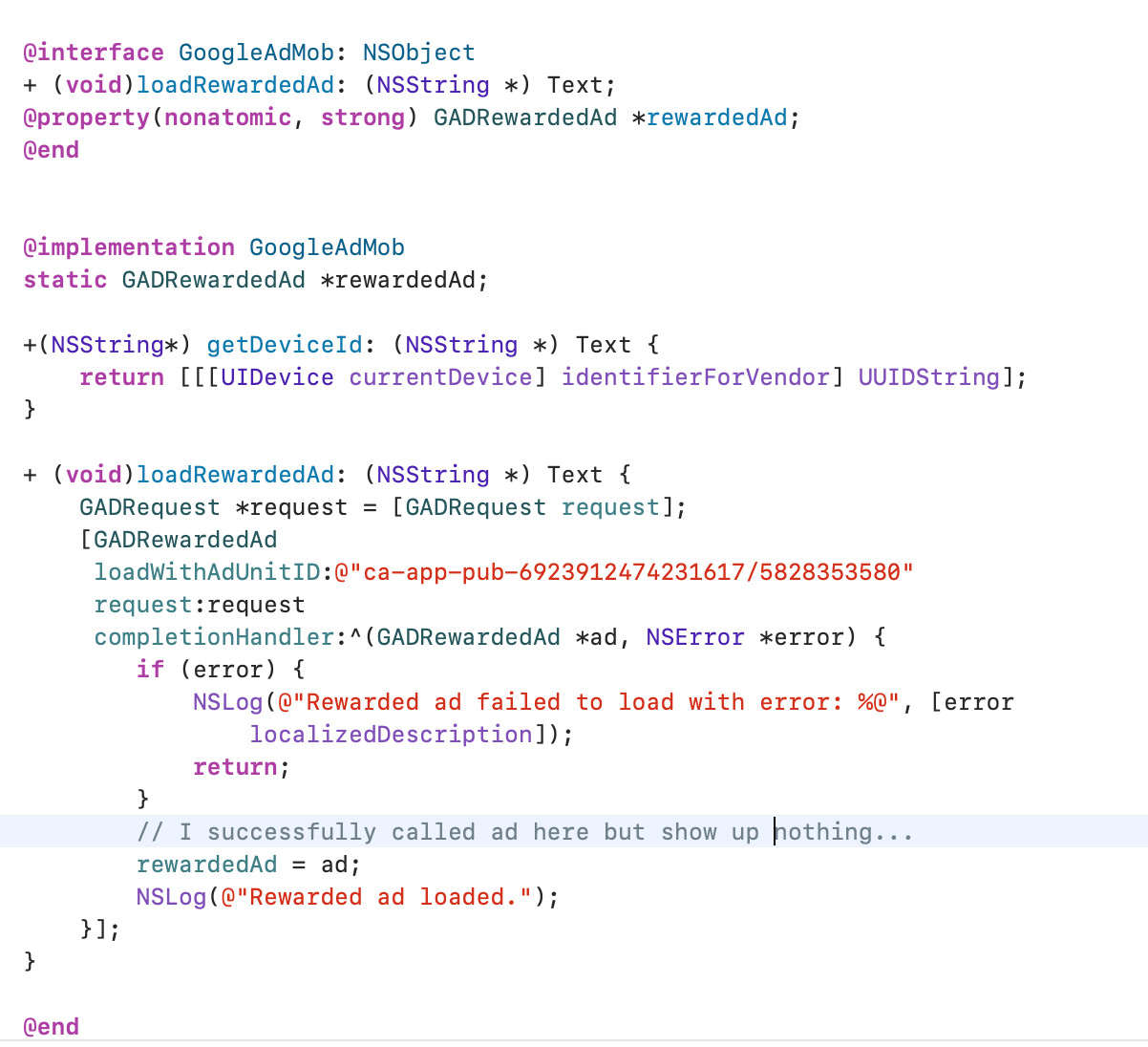 We have integrated AdMod on Android successfully. However, we have NOT found the solution on iOS yet. This is the error we made, kindly help us check that
