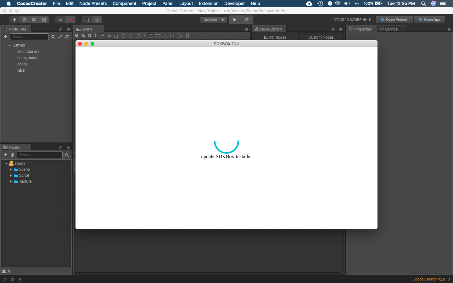 I tried to install SDKBOX through cocos creator interface but it stuck at loading