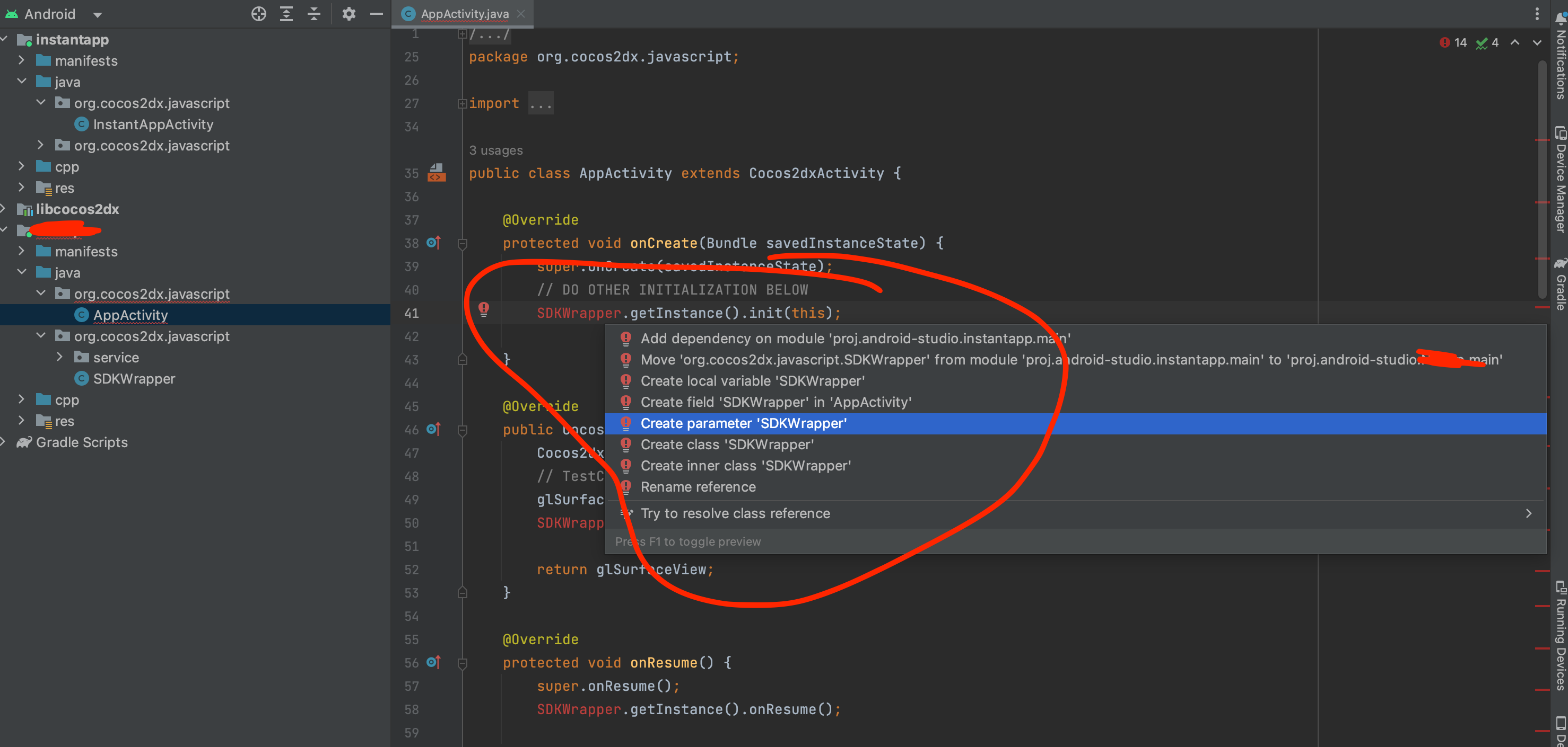 I can see the two same folders in your project, Please make sure AppActivity and SDKWrapper in the same folder.