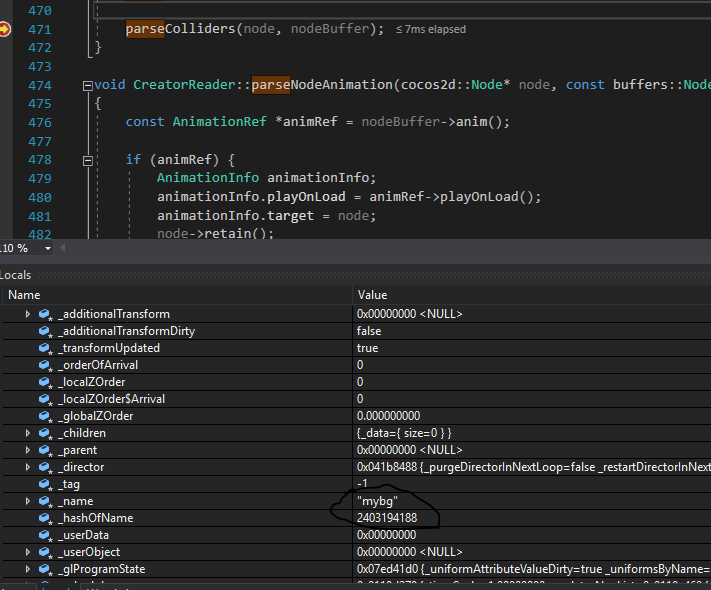 It is clear that the createNode function that the âCanvasâ is correctly loaded. Futhermore, from the breakpoint in the parseNode function, it even shows that a node with the name âmybgâ is parsed.