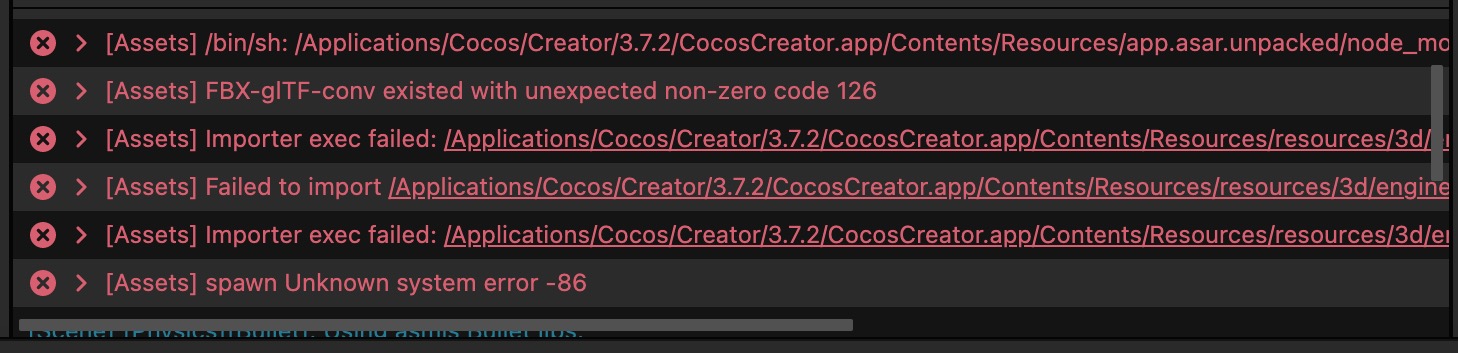 I made a project in windows and I want create an IOS build for the same now. On opening cocos creator here I’m getting importer exec failed errors.