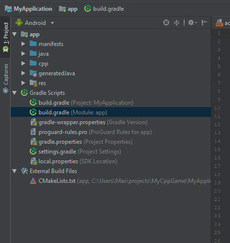 The one in MyApplication/build.gradle is identical to the one in proj.android/build.gradle and Gradle Scripts/build.gradle