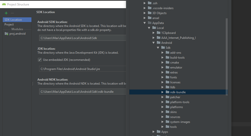 So, the ānewā project is running, what is great. I would now suggest to compare the two build.gradle (within proj.android and proj.android\app), the local.properties and gradle.propertiea files. They seems to be different.