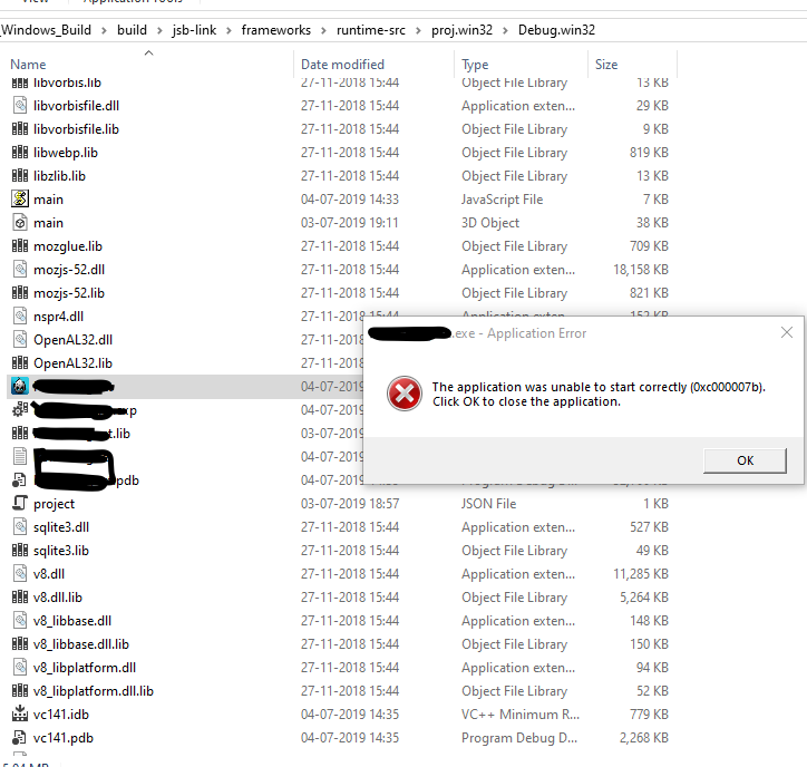 Android, iPhone and web. Now I want to make a build for Desktop(windows build), I have install vs2017, python2.7.10, ndkr19c and ant etc, on my windows 10 Pc. when I making a Debug/Release Build its complete success and make .exe file, and when I run that exe file its give error like