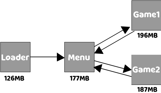 Going to the second game, if I start the game again, the second game is 187MB and going back to the menu is 193MB, it happen the same. But if I open both games and going back to the menu, the difference its summed, and I have 6 games!