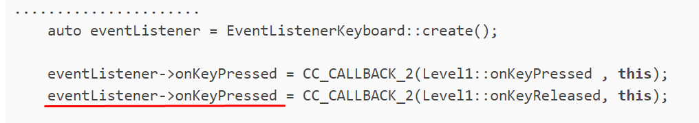 eventListener->onKeyPressed = CC_CALLBACK_2(Level1::onKeyPressed , this);