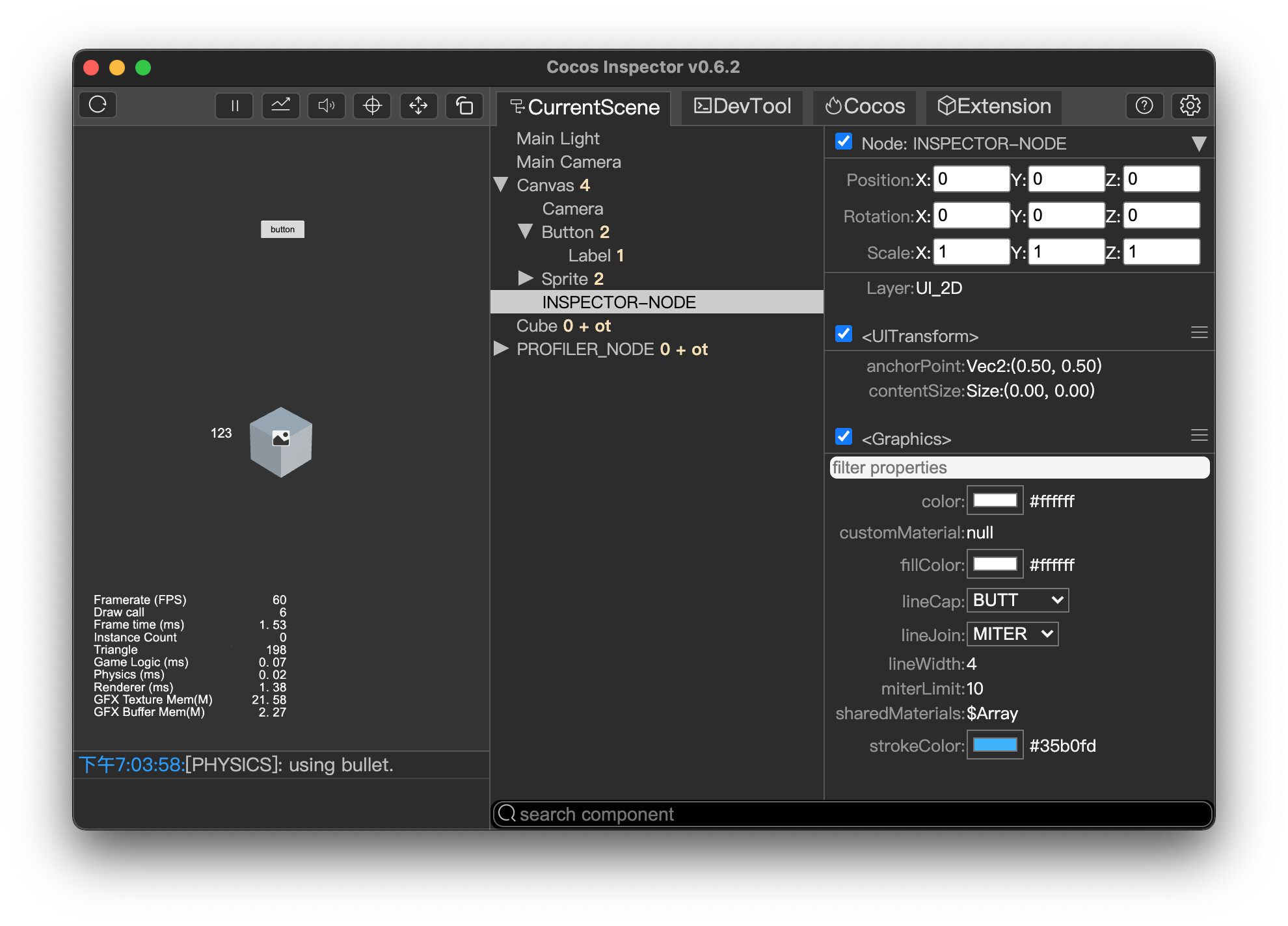 it supports realtime node tree display and control, and drawcall num show of almost every node, and show & edit beautiful components detail of selected node