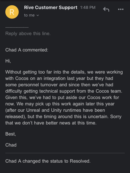 I put in a ticket for support for the Rive app and I encourage everyone to put in a ticket request themselves to show the priority in it.