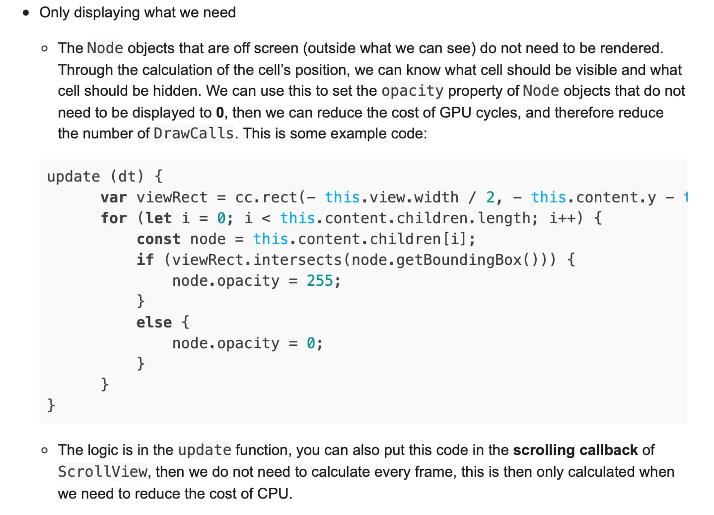 Cocos Creator ScrollView Performance Optimization Note: This article is based on Cocos Creator 2.1.2 version Note: You can reference to this demo project Introduction and why are there performance problems The ScrollView component of Cocos...