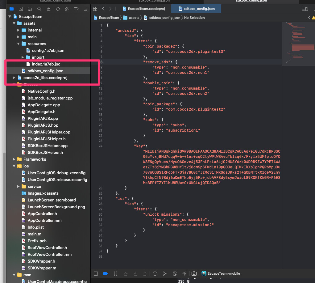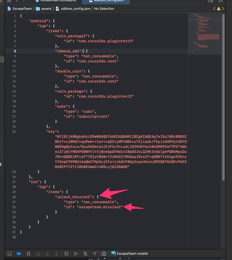 Note that it can’t find unlock_mission2 (which is my internal ID, not what I use on AppStore Connect (‘escapeteam.mission2’) ) – does it have problems finding my sdkbox_config.json? It was put in place automatically when I installed SDKBOX (and imported IAP) via the command line. It’s here: