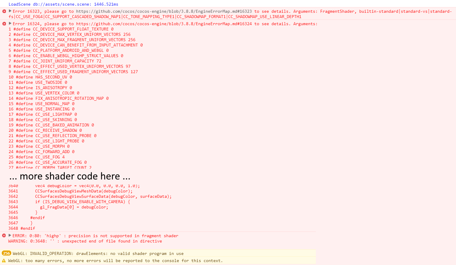 Error 16323, please go to https://github.com/cocos/cocos-engine/blob/3.8.8/EngineErrorMap.md#16323 to see details. Arguments: FragmentShader, builtin-standard|standard-vs|standard-fs|CC_USE_FOG4|CC_SUPPORT_CASCADED_SHADOW_MAP1|CC_TONE_MAPPING_TYPE1|CC_SHADOWMAP_FORMAT1|CC_SHADOWMAP_USE_LINEAR_DEPTH1