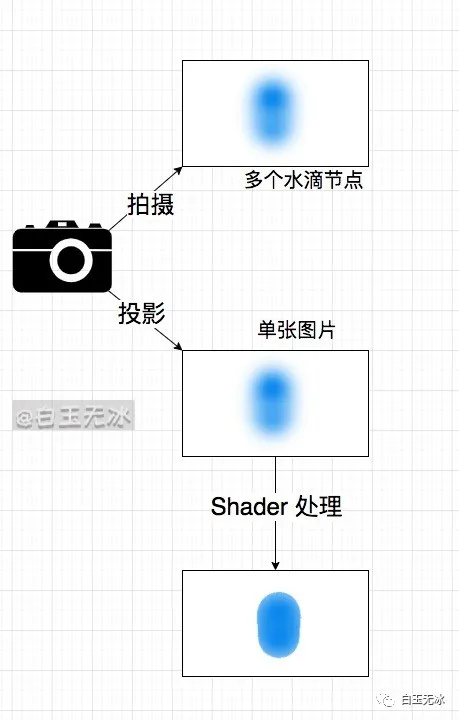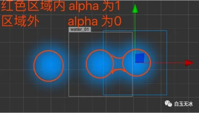 When the two translucent circles of a water drop are close, the transparency of the overlapping areas for the translucent circle will decrease. The part that is less than the alpha threshold is treated as still being translucent, and the part greater than the alpha threshold is treated as opaque. In this way, the water drop connection effect can be achieved.