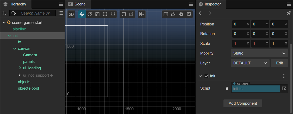 The previous article briefly mentioned this entry script named init.ts. It checks if the device supports WEBGL adn give a prompt if it is not supported. It also sets the init node to be persistent to ensure the normal execution of the game logic.