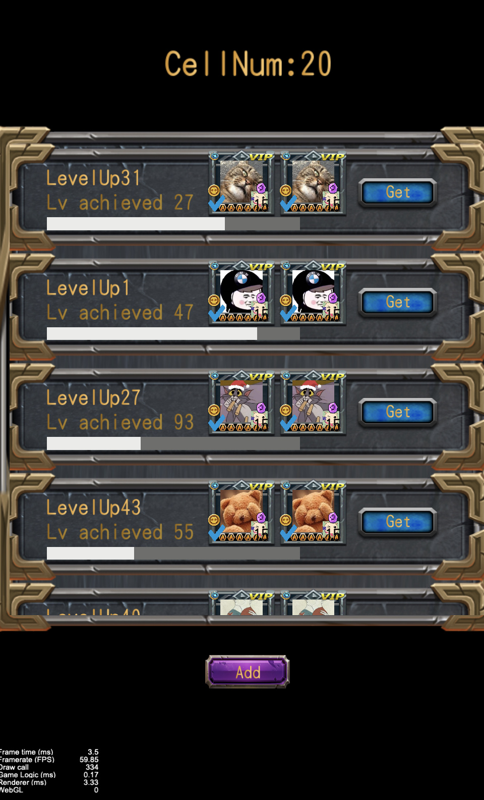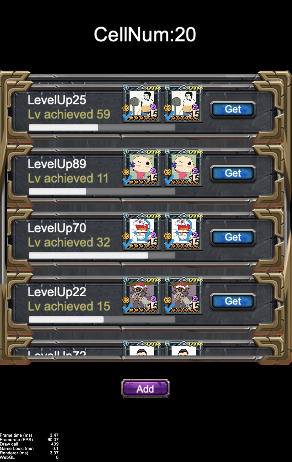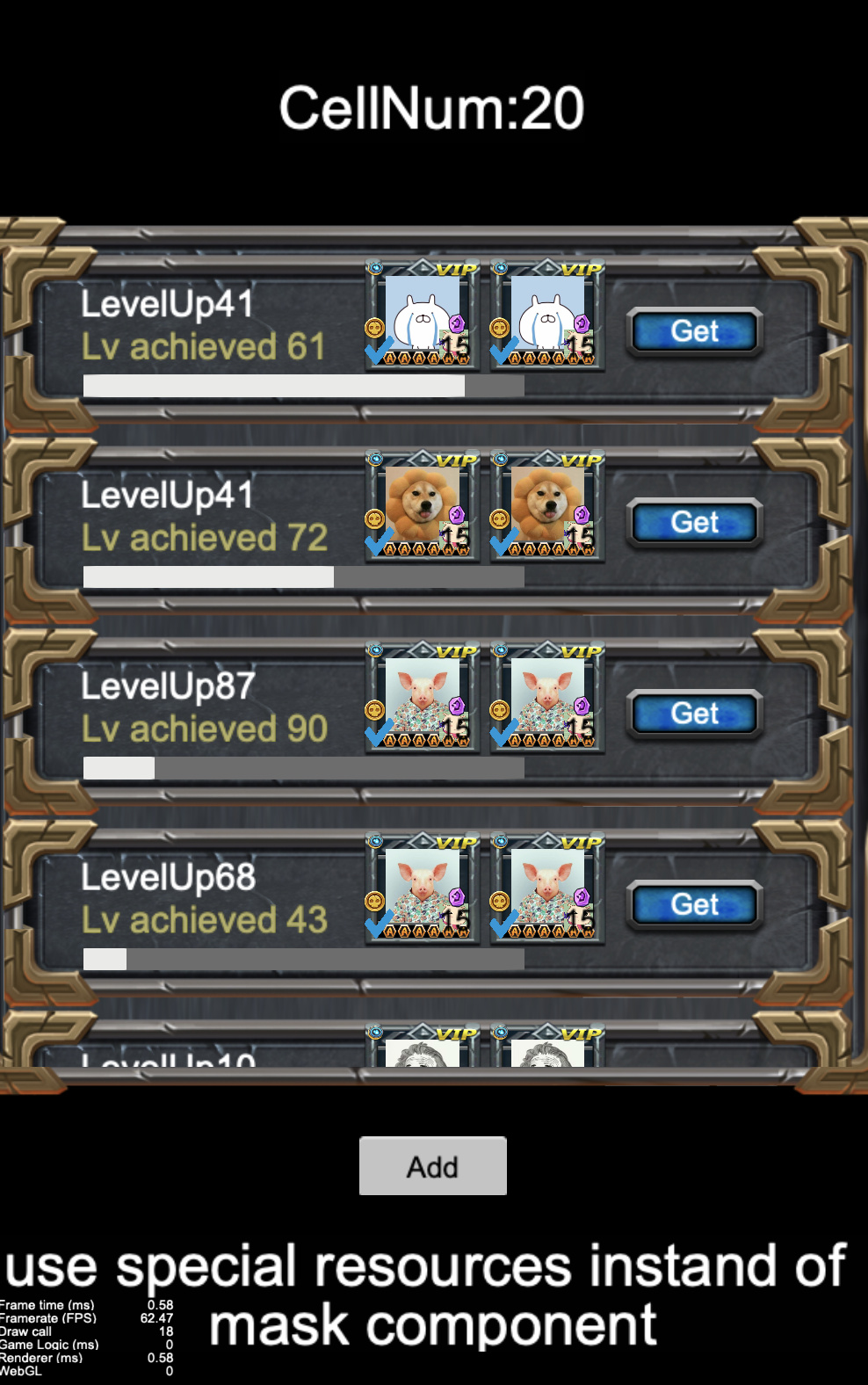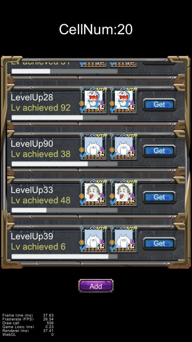 The ScrollView component in this scene has 20 cells,the total DrawCall has reached 790. A single cell has about 50 child-nodes, and in total about 1000 Node objects in this interface. Can you see why performance is an issue?